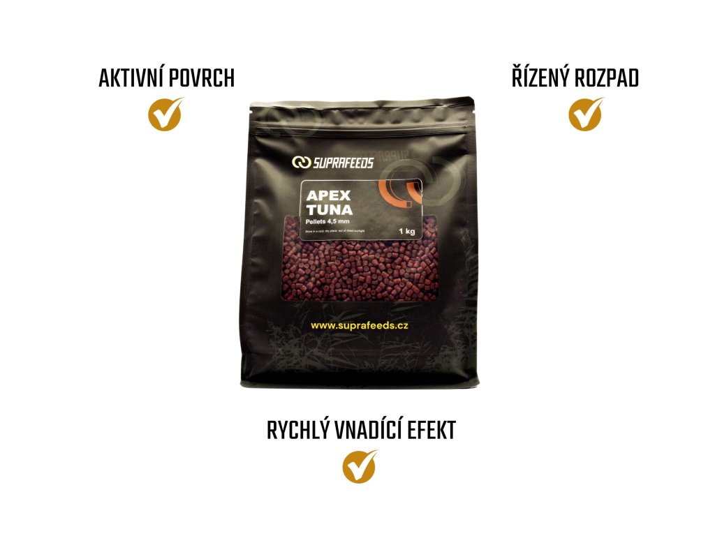 APEX TUNA krmné pelety mají řízený rozpad a skvěle doplňují krmný partikl. Díky své menší velikosti jsou ideální také do PVA punčoch a sáčků.