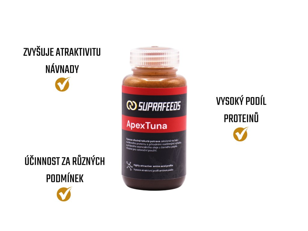 APEX TUNA tekutá potrava se snadno rozpouští ve vodě a účinně láká ryby do loviště. Lze ji využít i při výrobě vlastního boilies.
